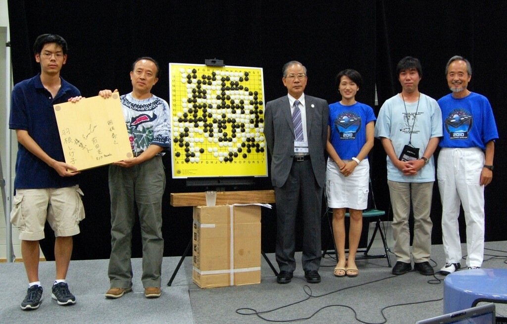 marathon viewed by a rapt crowd of hundreds at the U.S. Go Congress as well as a worldwide audience that watched commentary by Yasumasa Hane 9P, Shigeko Hane 1P and Ryo Maeda 6P broadcast live on KGS as well as a live video feed of both the Board 1 game and the game commentary. After the game, the board used by the two players – a brand-new 2-inch Korean hiba table board – was signed by the players and pros and will be auctioned off at the Congress Banquet tonight to benefit the American Go Foundation.