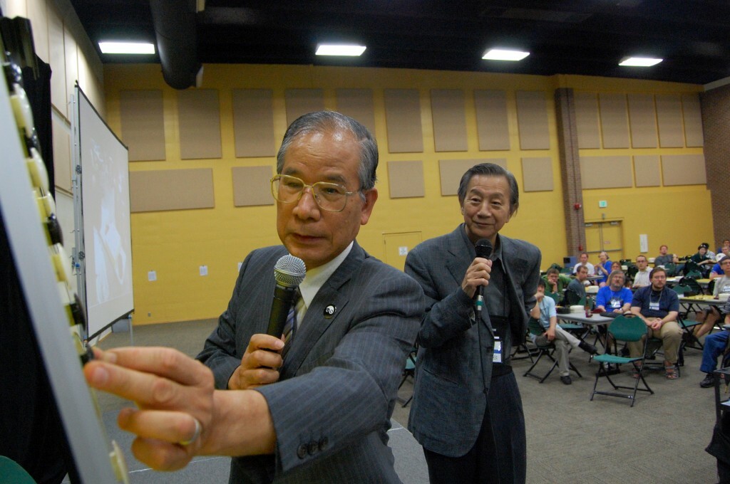 hundred attendees,while hundreds more watched on KGS: on one screen was the actual game and a cloned game with Hane's commentary, on the other was a live video feed showing the players. Hane began the game commentary and eventually it was taken over by Maeda and Shigeko; all three -- with the able assistance of translators Yoshi Sawada and Shoji Honsono -- kept everyone entertained and engaged. At the three-hour mark the two players were still battling it out but the crowd, the commentators and the translators were transfixed, and the detailed commentary continued right through the end of the 4-hour, 3-point marathon game, which didn't finish until after 11 p.m.