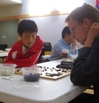 Twenty six kids and adults played in the September monthly ratings tournament this past Saturday in Palo Alto, CA. Jean-Baptiste Chaubet 1d (right in photo), visiting from France, led the field of a dozen dan-level players with three wins. In the kyu division, Eric Hoffman 2k, Jay Chan 3k, Roger Schrag 5k, Tom Rike 6k, and Eric Sumner 17k picked up two wins apiece. Next month's Bay Area Go ratings tournament is scheduled for