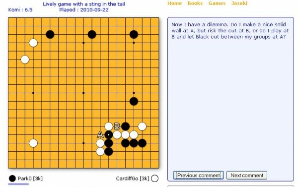 Cardiff Go Club in Wales, UK, “It embraces ideas such as access to key moments in games via a list of clickable position descriptions, and a list of alternative move sequences by description.” The site includes games for beginners, josekis, “guess the next move” and game commentaries. In most games, a list of key game positions is presented. Click on 'Black has now created a large moyo', for example, and you will be taken you to that exact board position. Moffatt adds that “The site as it stands is in essence a kind of go blog, but it may develop beyond this” and notes that it does not work with Internet Explorer. “It may or may not be palatable to a large audience,” he says, “The user testing to date seem to be relatively happy with it.”