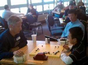 Harvest tournament organized by the Bradley Go Association and the Quad Cities Go Club in Peoria, IL. Austin Kupon 3d went 5-0 in a Dan division headed by two 6-dan players. Second place went to Xuyu Xiang 6d with a score of 4-1. In the second division (1-7 kyu), Myron Souris 1k took first on tie-breaks over Ken Crumpler 6k and Stephen Choung 7k, all at 4-1. David Muskovitz 8k won the third division (8 kyu and below) on tie-break over Matt Mueller 11k, both with a score of 4-1. Clark Wierda was awarded a special prize of black and orange go stones in jack-o-lantern bowls for traveling the greatest distance for the tournament. "More than half the field benefited from the generous merchandise prizes provided by Kiseido/Yutopian, Slate and Shell,