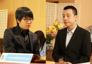 , which were held November 3, Gu Li (r in photo) defeated Kim Jiseok 7P by a mere half-point, and Heo Yeongho (l in photo) defeated Park Junghwan 8P by resignation, so both advance to the finals. In the