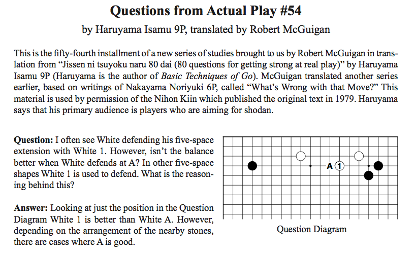 “I often see White defending his five-space extension with White 1. However, isn’t the balance better when White defends at A? In other