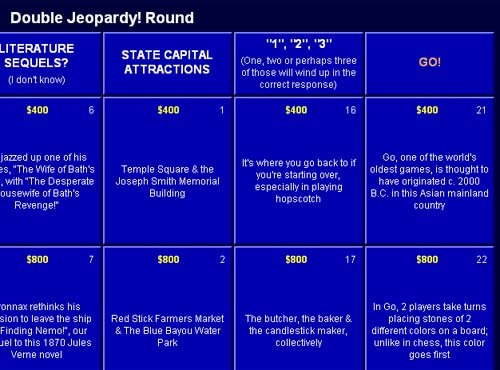 to see how you score on the go-related questions on the December 13 Jeopardy: scroll down to the Double Jeopardy! Round and it’s the last column on the right; answers are revealed by hovering over the amount in the box.