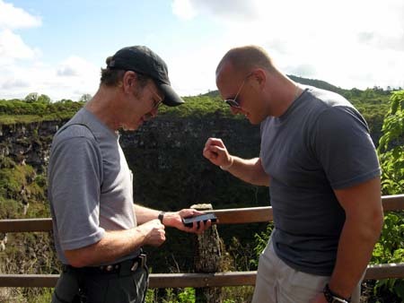 board but I did have my iPhone with the SmartGo app. The problems kept me occupied in airports and ports and odd times. The touch board -- especially for playing 9x9 -- is great. And it's not a bad opponent, either; at two stones on the 9x9, I have to be cleaver to win." While visiting the Galapagos, Benson showed the game to Dan Matzat of Chicago. "I had to get a picture after I thought of 'GalapaGo'," said Benson. "Here we are playing at 'Los Gemelos' on Santa Cruz island. Dan had never heard of the game but enjoyed it."