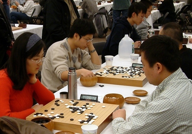 photo: Xiruo Liu (l) and Minshan Shou (r) were the only players with 4-1 records going in to the last round. Zhaonian (Michael) Chen has white on Board 2 (center), playing Kevin Huang (not visible, at right, behind Minshan Shou). Both are former New Jersey State champions, as is Andy Liu on board 3 (to Chen’s right, behind water jug). Photo courtesy Rick Mott
