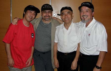 photo: Yoshi (far right), with Maeda Ryo 6P (l), Garlock (2nd from l) and Takemiya Masaki 9P (2nd from r); photo by Phil Straus