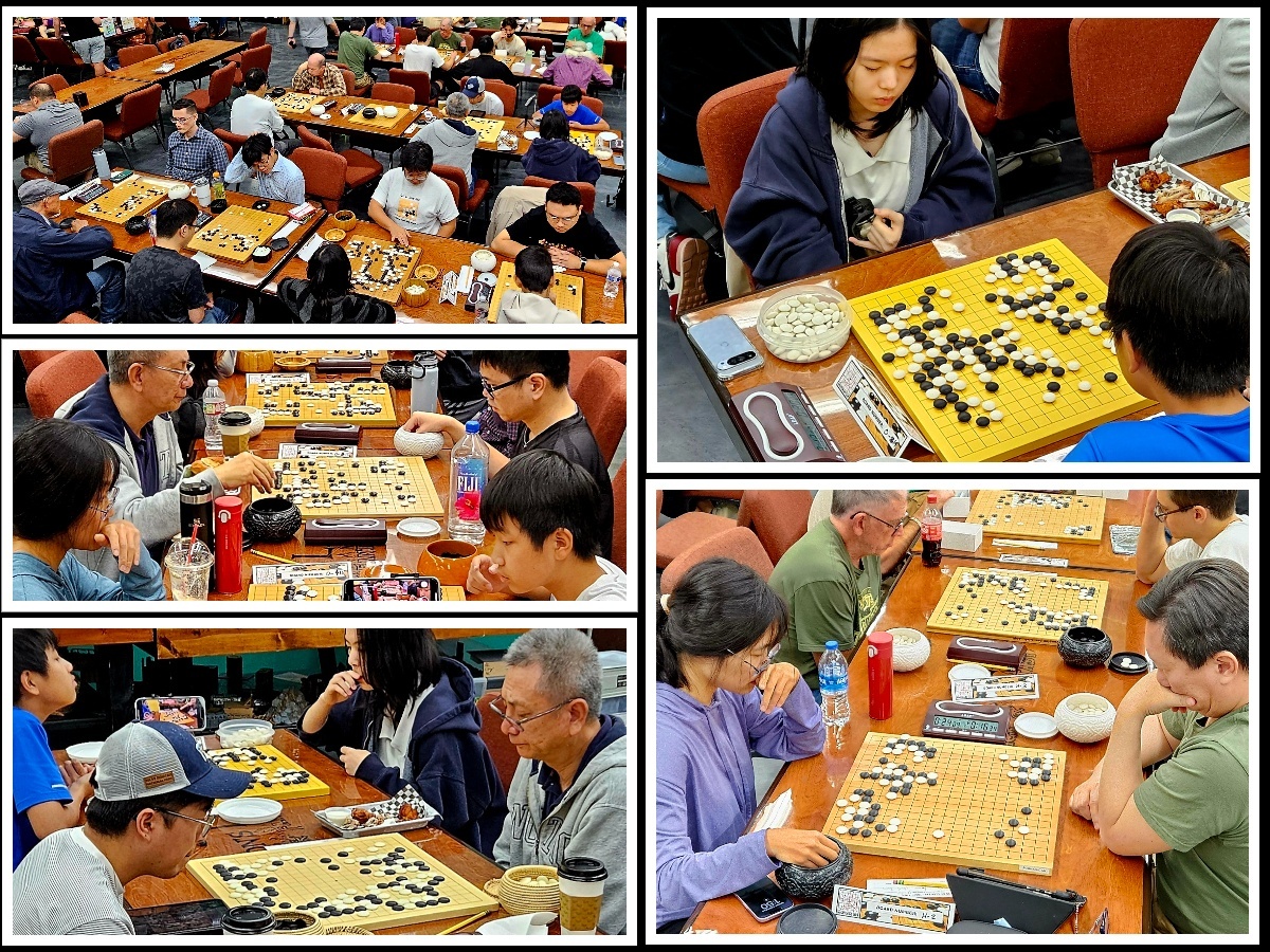 photos: (top) at the tournament venue; (bottom) (top left): Salik Abbasi, Bowei Xu 6d, Michael Bloom and Juanshu Lan 6d; (top right) Ian Johnson 14k; (bottom right) Peilung Peng 2D; (bottom left) Kuanfu “Paul” Tung 8k. 📸 Full photo gallery
